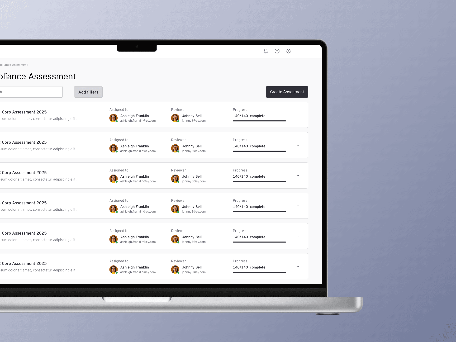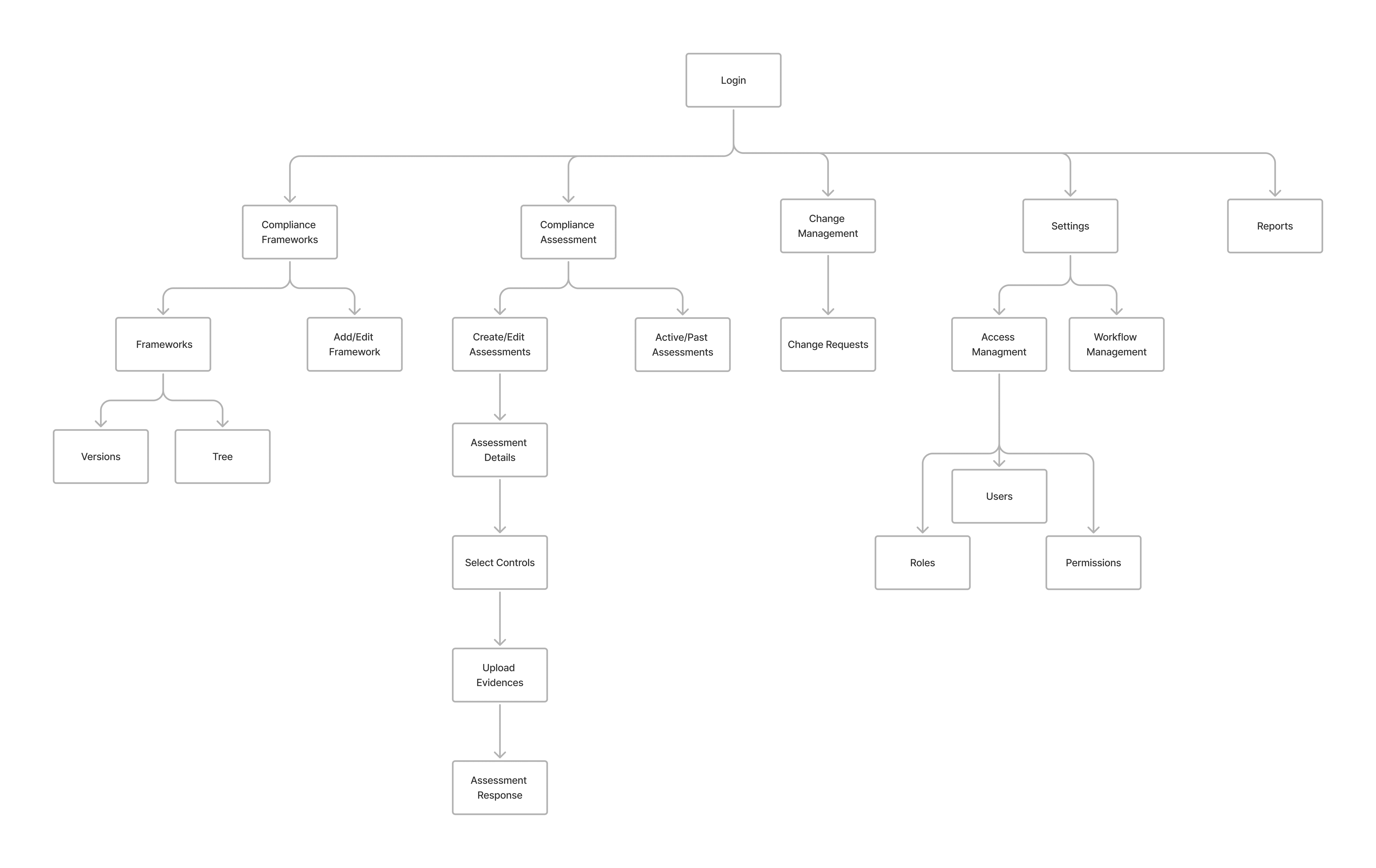 I started with low-fidelity wireframes, tried various layouts and navigations, explored main features such as compliance assessment, compliance management.