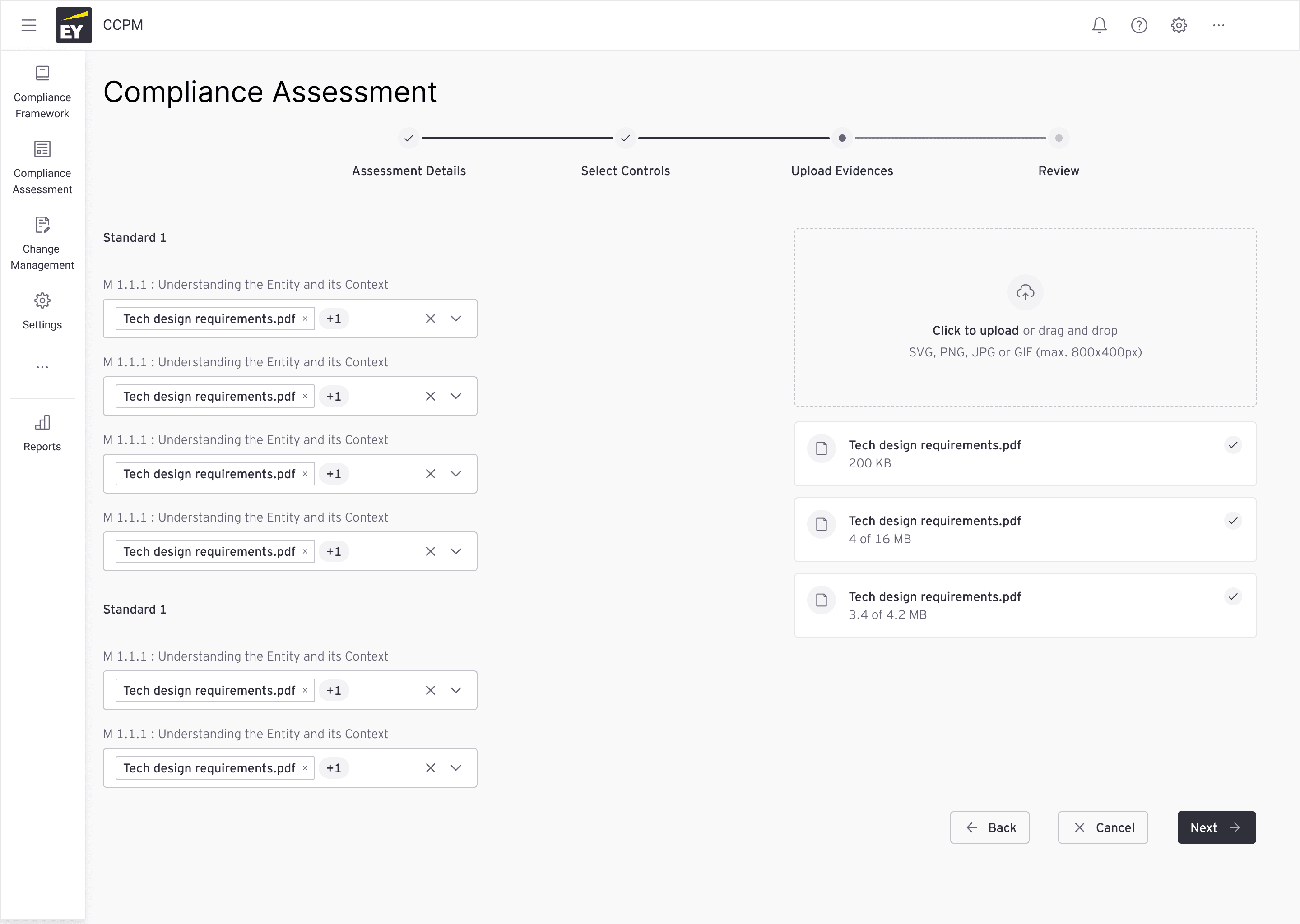 This flow shows how you can create an assessment, select the sub-section controls you want to add to the assessment, upload the documentation/project documents, it will automatically check and give you a compliance score.